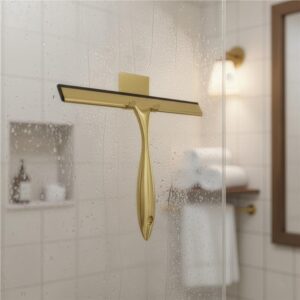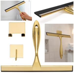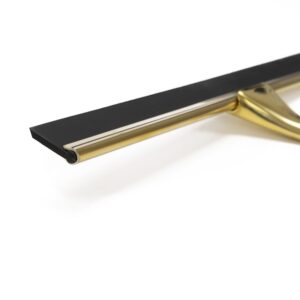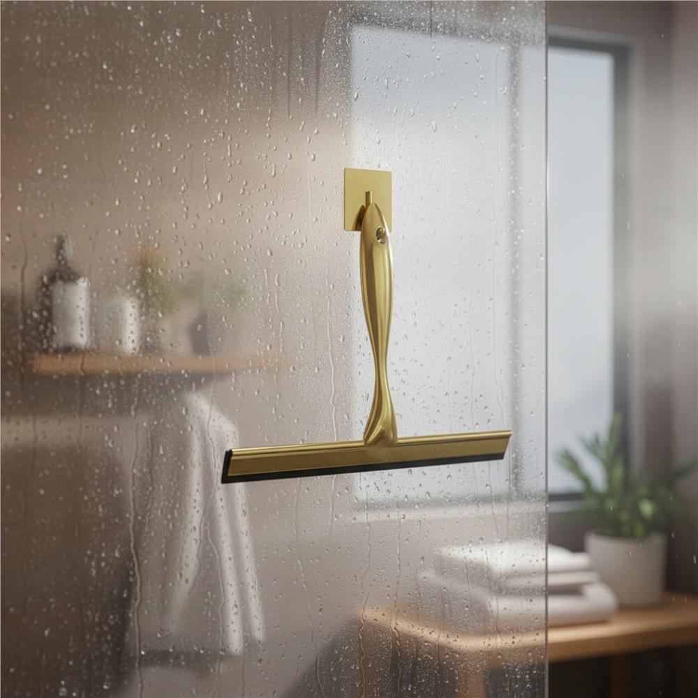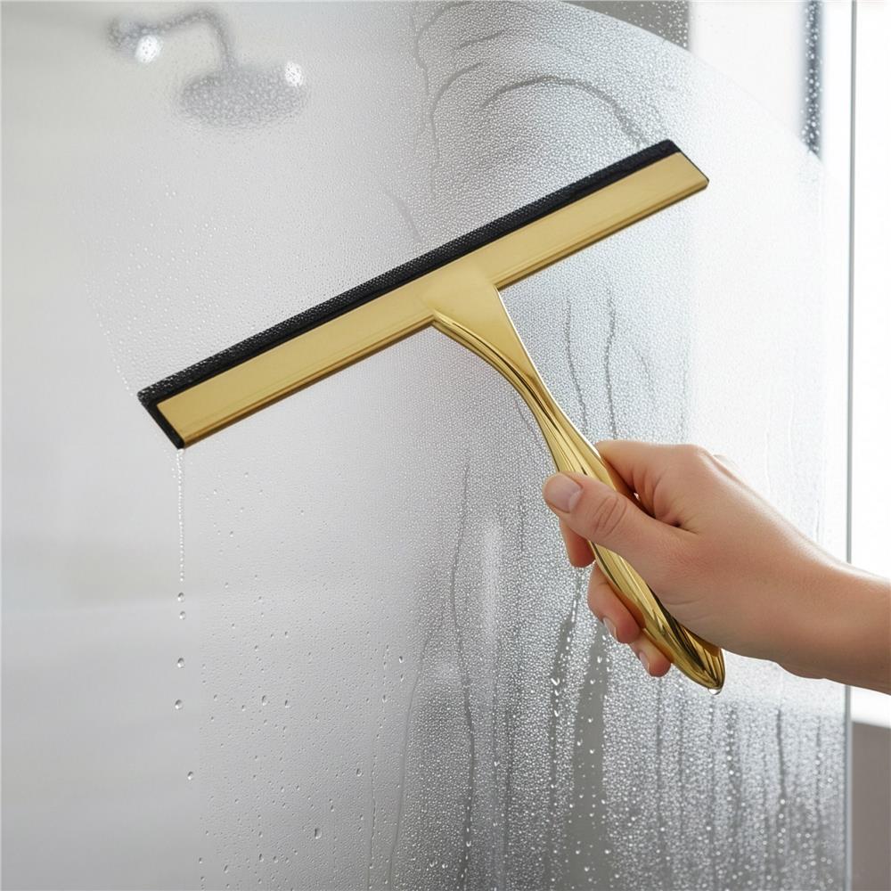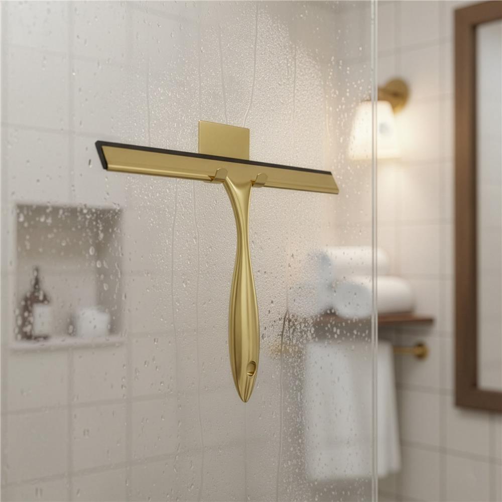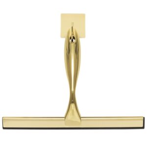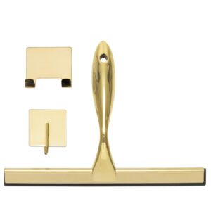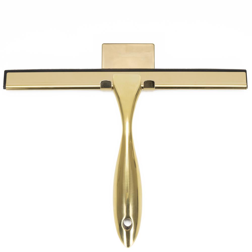 Racleta pentru baie realizata din otel inoxidabil cu finisaj lucios auriu, destinata indepartarii rapide a apei de pe suprafete netede. Manerul cu forma fluida ofera prindere confortabila, iar cele doua suporturi permit depozitare flexibila fara gaurire.