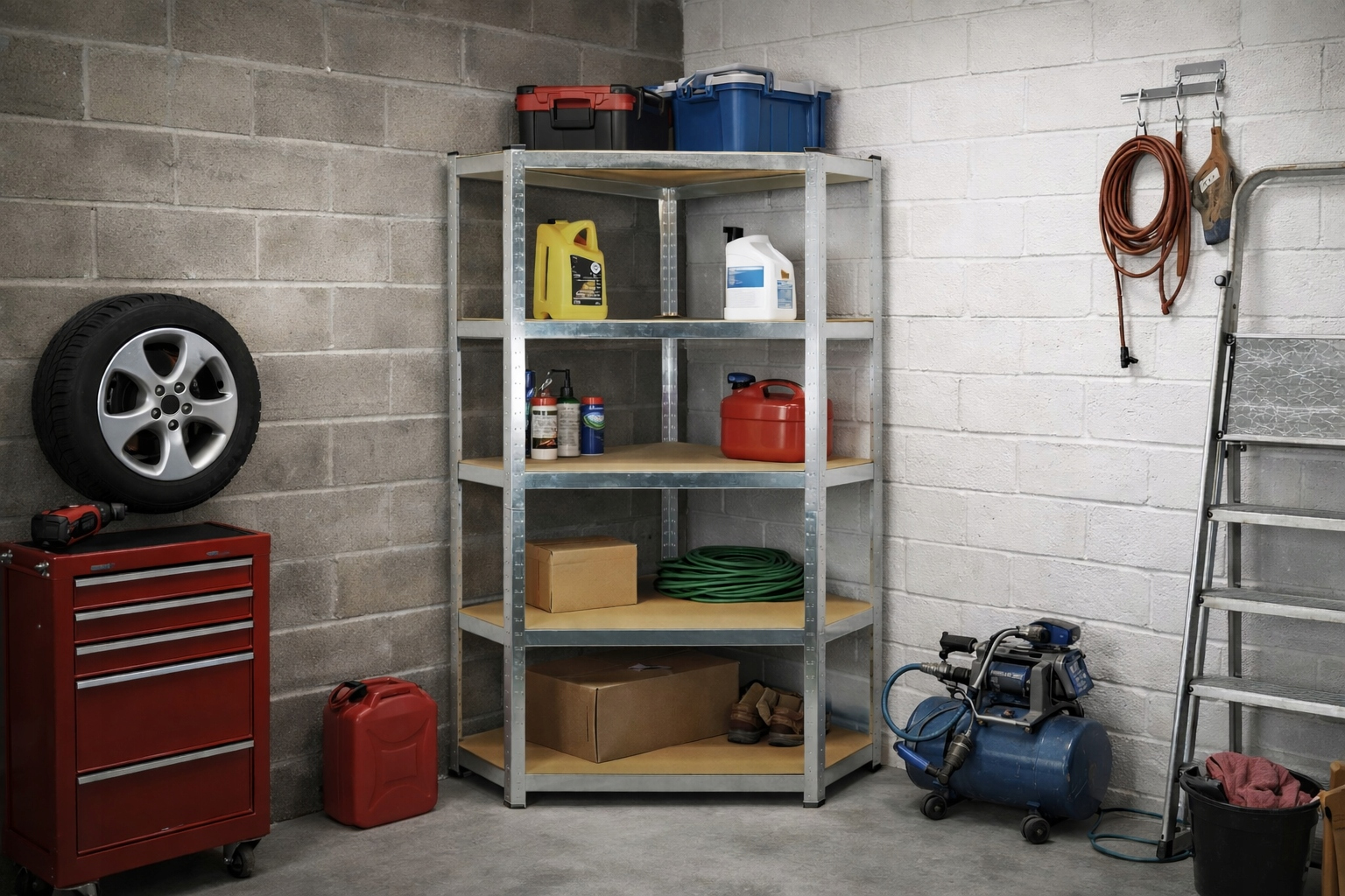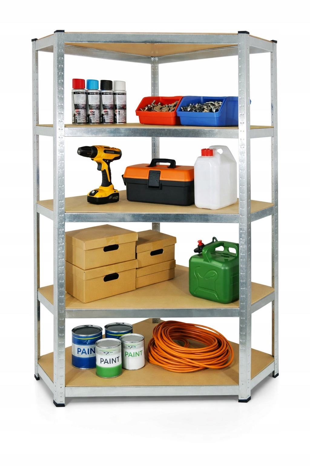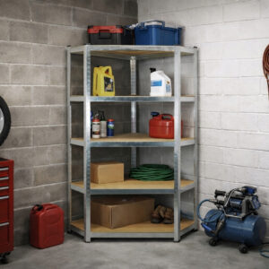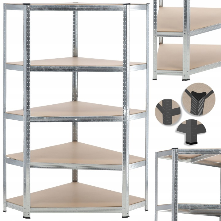 Acest raft metalic de colt cu 5 niveluri este o solutie practica si rezistenta pentru organizarea eficienta a spatiilor de depozitare. Structura din otel galvanizat ofera stabilitate ridicata si rezistenta la coroziune, iar politele din MDF permit sustinerea unor greutati mari. Designul de colt ajuta la utilizarea eficienta a spatiului, fiind ideal pentru garaj, atelier, pivnita sau magazie.