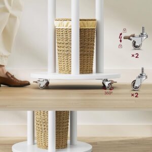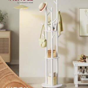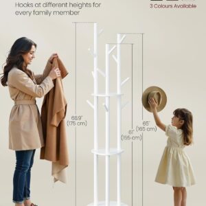 VASAGLE Cuier din lemn masiv, cu 11 agatatori si 3 rafturi, 4 roti detasabile rotative 360°, 40x40x175 cm, alb