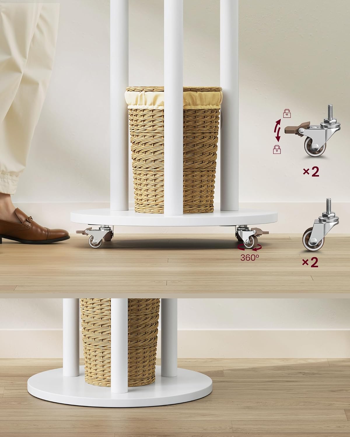 VASAGLE Cuier din lemn masiv, cu 11 agatatori si 3 rafturi, 4 roti detasabile rotative 360°, 40x40x175 cm, alb VASAGLE Cuier din lemn masiv, cu 11 agatatori si 3 rafturi, 4 roti detasabile rotative 360°, 40x40x175 cm, alb