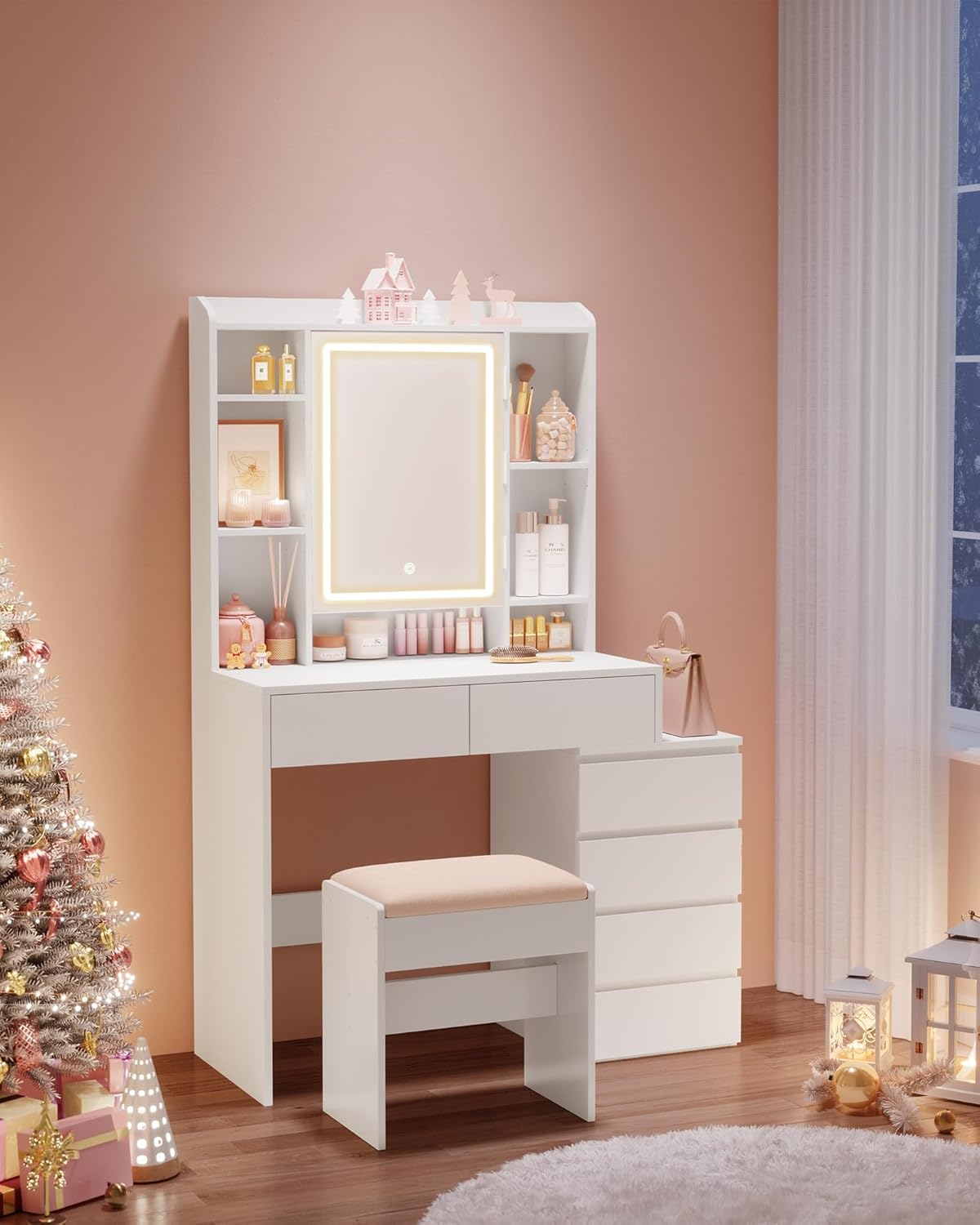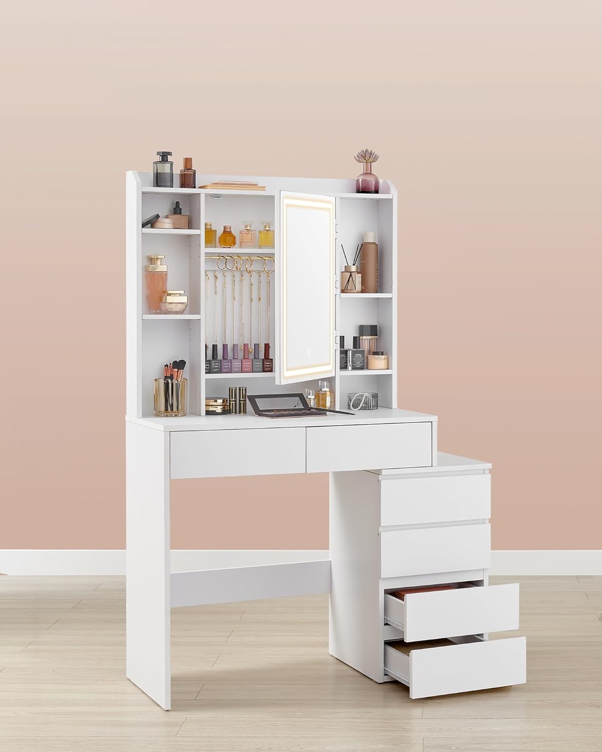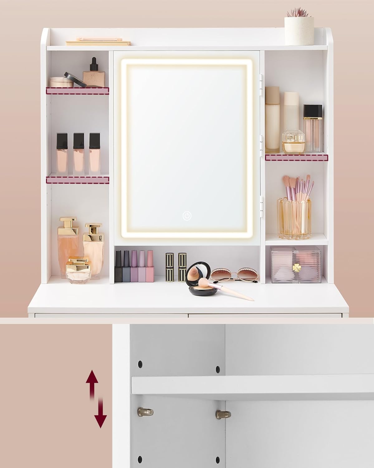 Masa de toaleta moderna ofera un spatiu generos pentru organizarea produselor de machiaj si accesoriilor. Oglinda cu iluminare LED reglabila permite ajustarea intensitatii si a culorii luminii pentru un machiaj perfect. Designul minimalist se potriveste usor in orice dormitor.