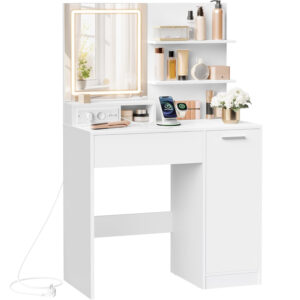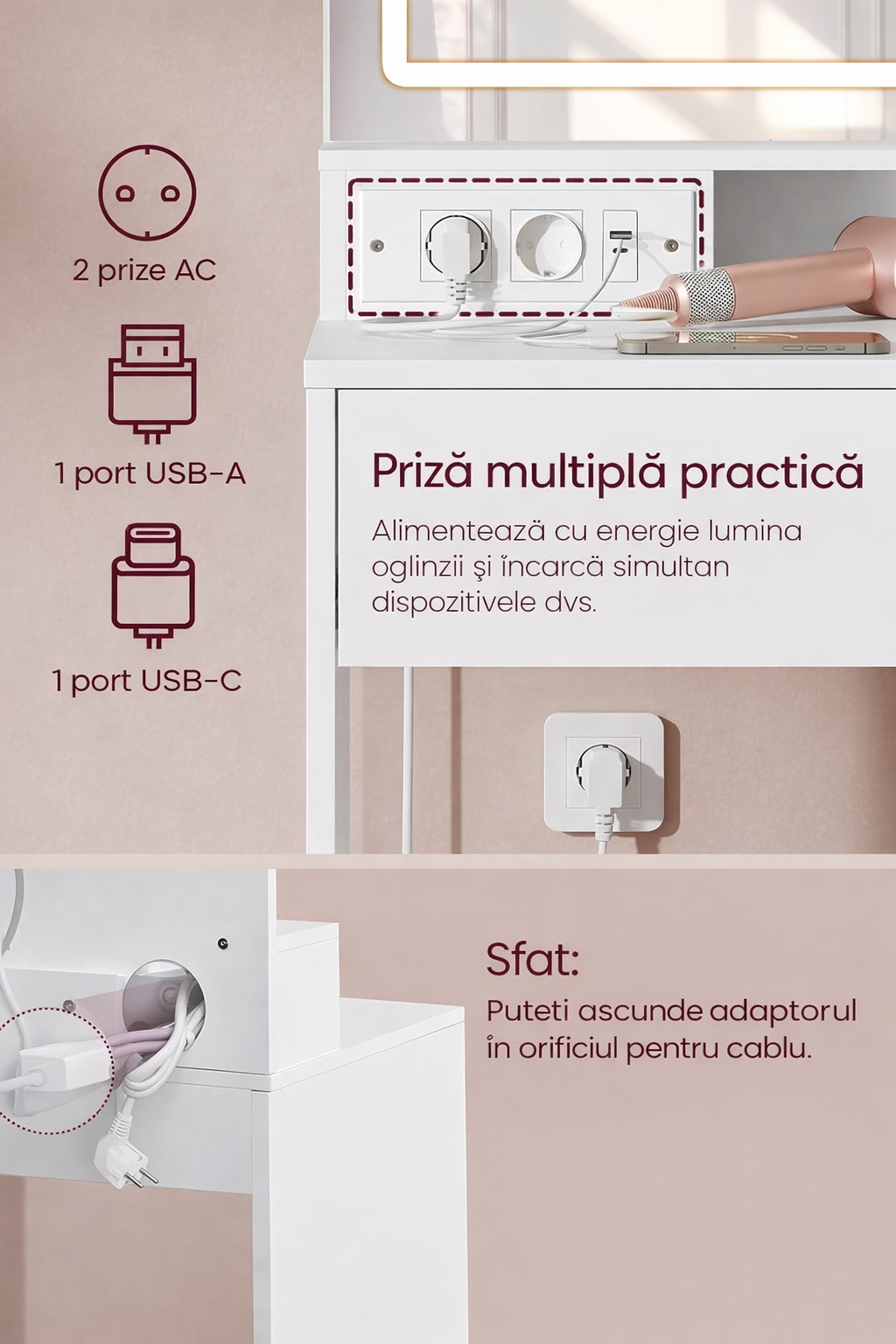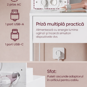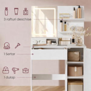 Masa de toaleta VASAGLE Kailyn imbina designul modern cu functionalitatea zilnica. Oglinda cu LED reglabil si priza integrata iti ofera confort maxim, iar compartimentarea inteligenta te ajuta sa iti organizezi toate produsele de beauty intr-un singur loc.
