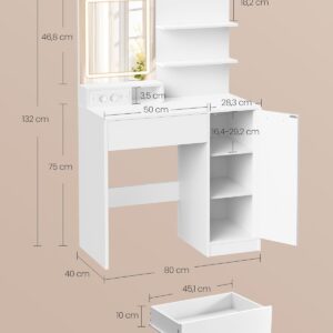 VASAGLE Masa de toaleta Kailyn cu oglinda LED si priza integrata, porturi USB, sertar, rafturi si dulap, PAL, 80x40x132 cm, alb