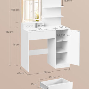 VASAGLE Masa de toaleta Kailyn cu oglinda LED si priza integrata, porturi USB, sertar, rafturi si dulap, PAL, 80x40x132 cm, alb VASAGLE Masa de toaleta Kailyn cu oglinda LED si priza integrata, porturi USB, sertar, rafturi si dulap, PAL, 80x40x132 cm, alb