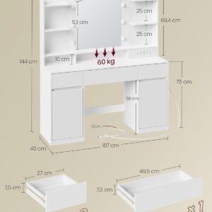 VASAGLE Masa de toaleta Kailyn cu oglinda, iluminare LED reglabila, priza integrata AC si USB, fronturi MDF, 40x107x144 cm, alb
