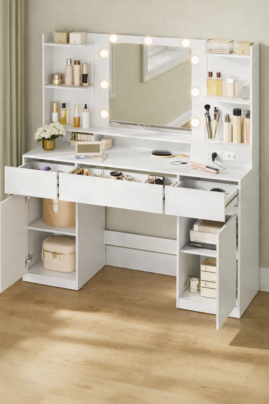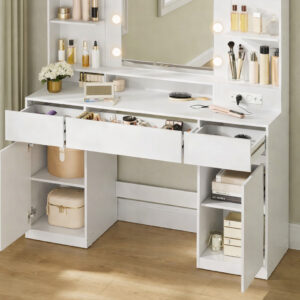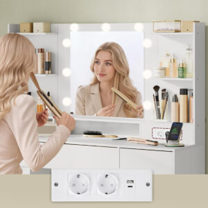 Masa de toaleta moderna din colectia Kailyn ofera un spatiu complet pentru organizarea produselor de machiaj si accesoriilor. Oglinda cu iluminare LED reglabila si priza integrata asigura confort si functionalitate in utilizarea zilnica. Designul minimalist se potriveste perfect in orice dormitor.