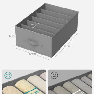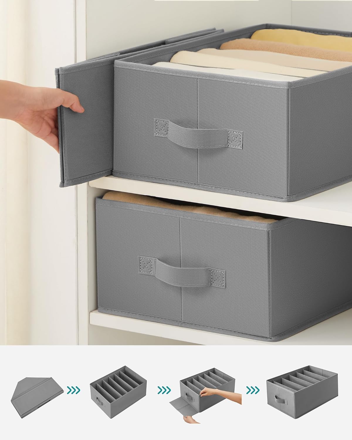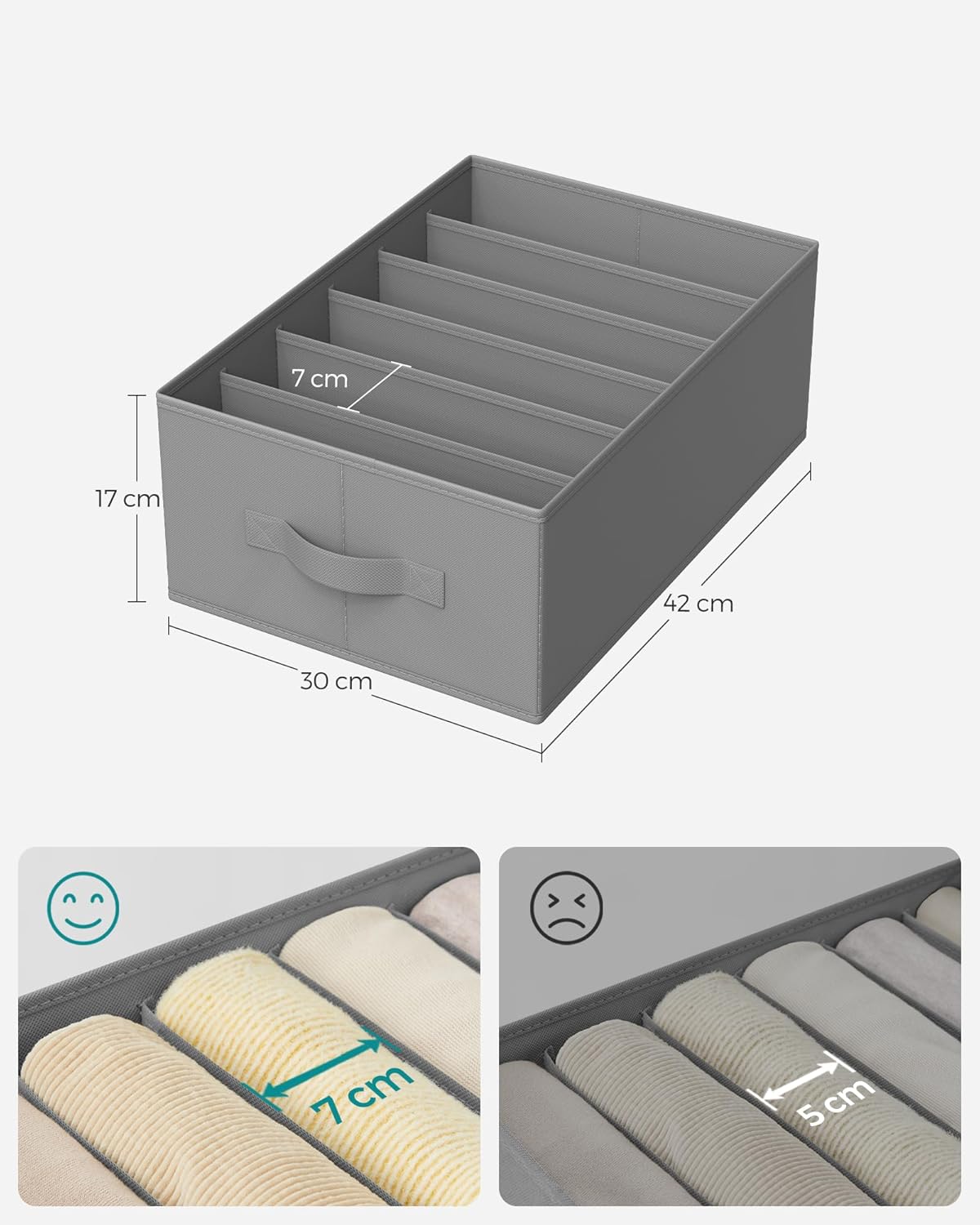 Setul de organizatoare pentru dulap este ideal pentru mentinerea ordinii in sertare sau rafturi. Fiecare cutie are 6 compartimente care permit separarea eficienta a hainelor, pantalonilor sau accesoriilor. Designul pliabil si stivuibil ajuta la economisirea spatiului si organizare optima.