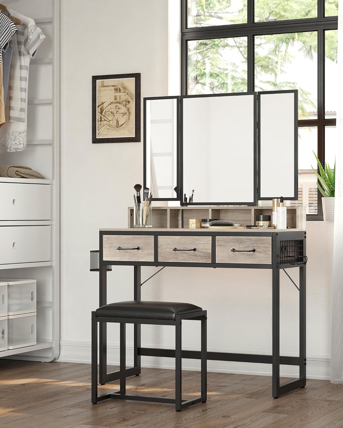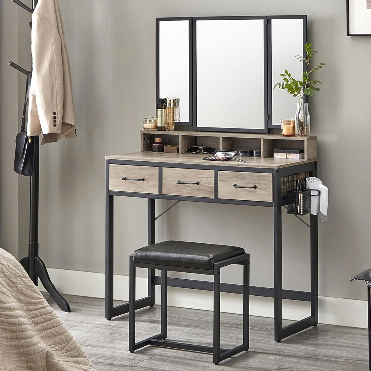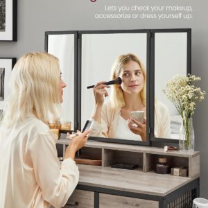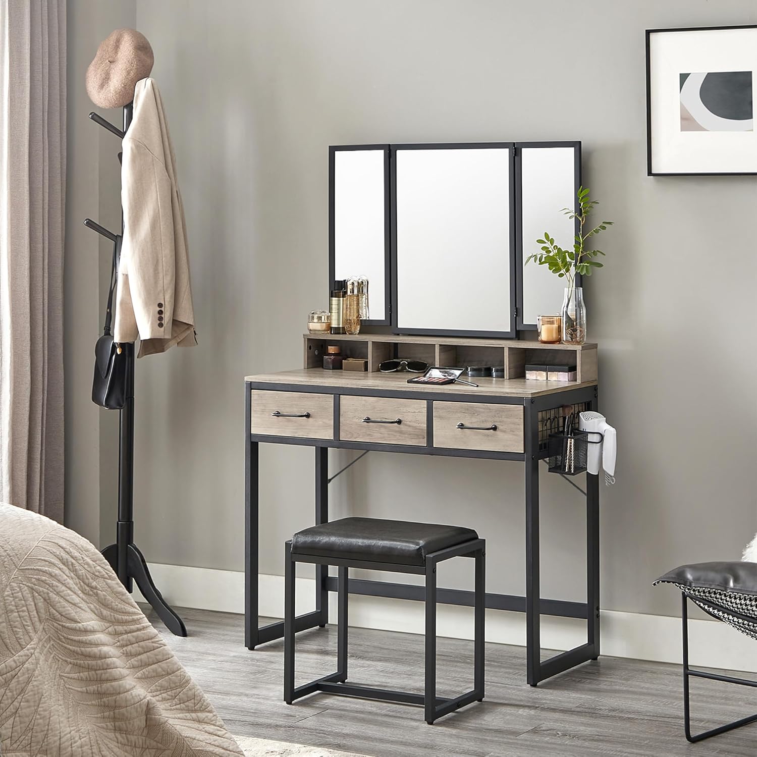 Masa de toaleta VASAGLE in nuanta greige cu negru aduce un echilibru perfect intre functionalitate si design industrial modern. Oglinda tripla pliabila permite aranjarea machiajului si coafurii din toate unghiurile, iar sertarele si compartimentele ofera organizare eficienta pentru cosmetice si accesorii.
