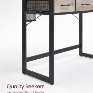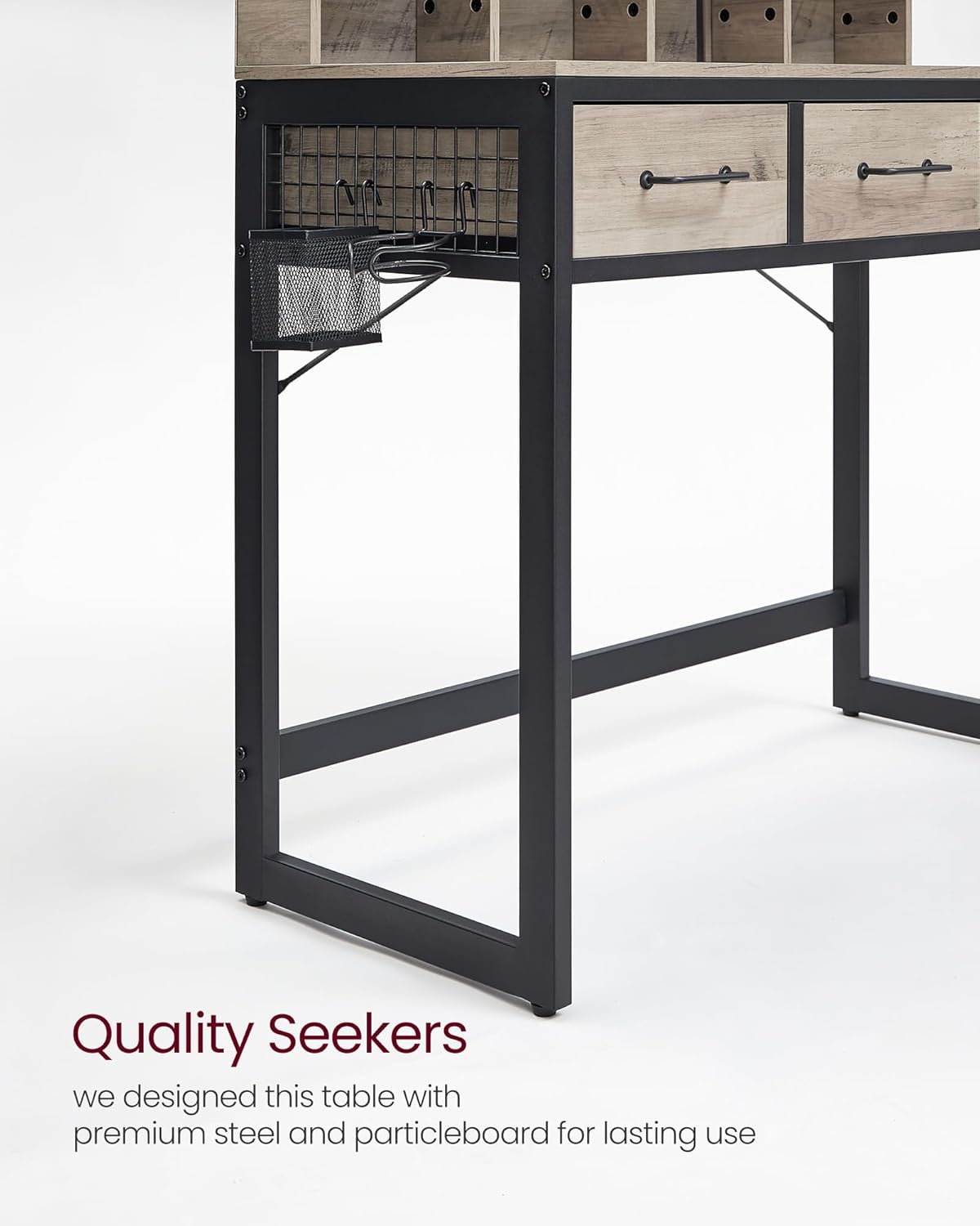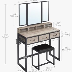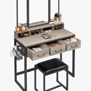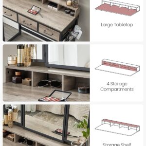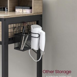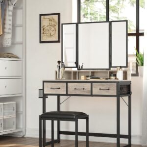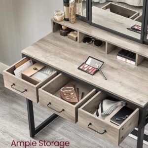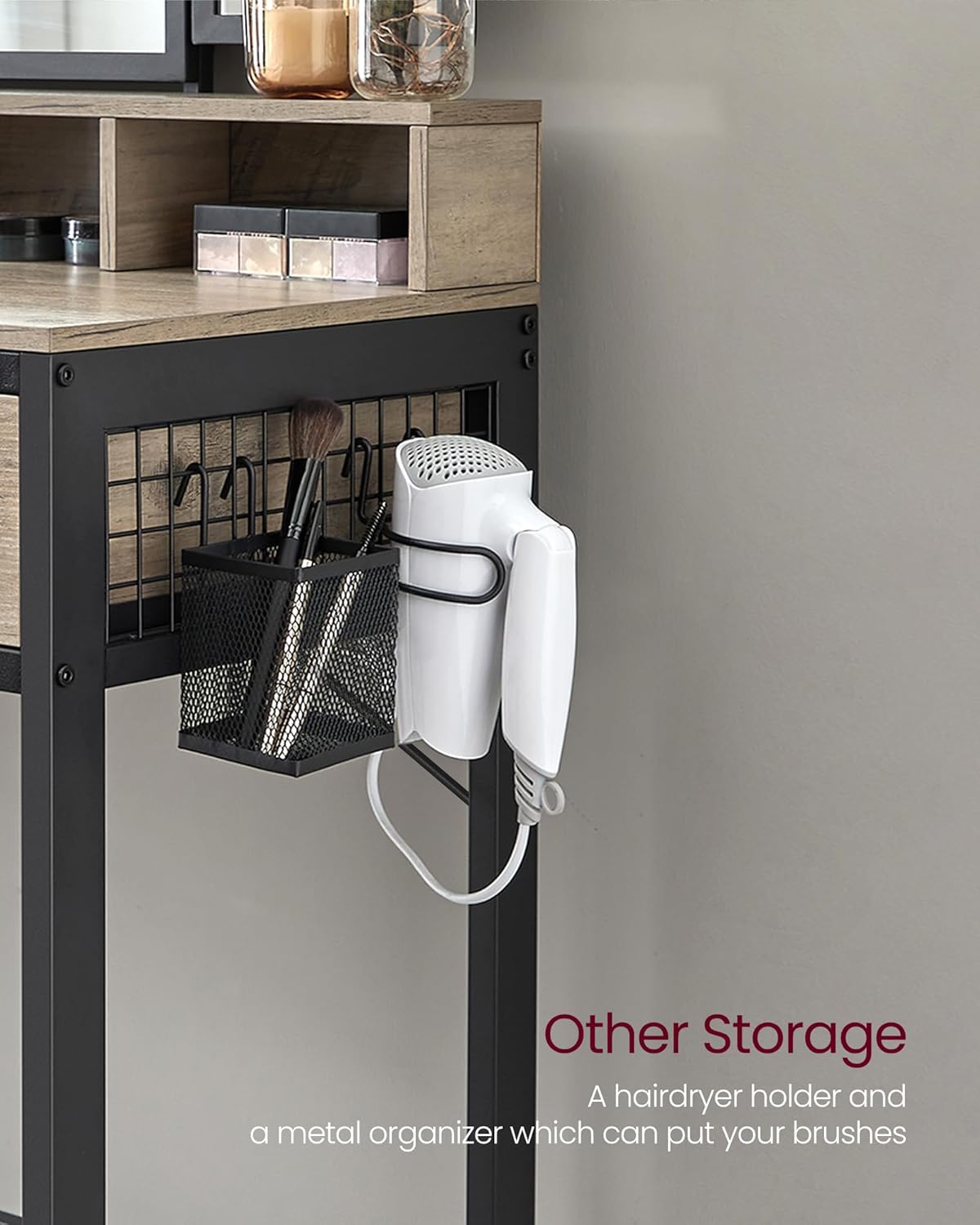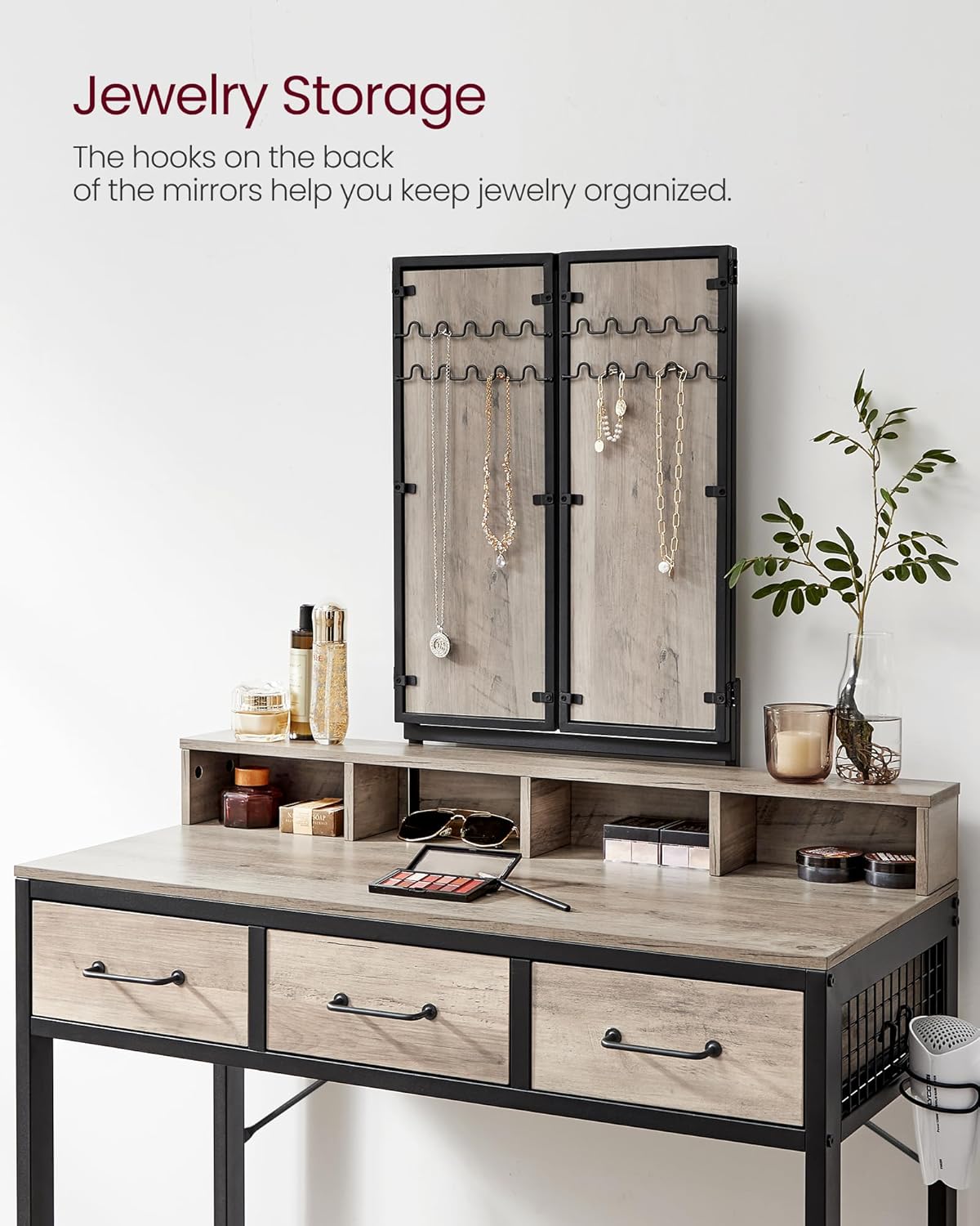 Masa de toaleta VASAGLE in nuanta greige cu negru aduce un echilibru perfect intre functionalitate si design industrial modern. Oglinda tripla pliabila permite aranjarea machiajului si coafurii din toate unghiurile, iar sertarele si compartimentele ofera organizare eficienta pentru cosmetice si accesorii.