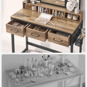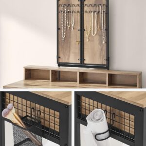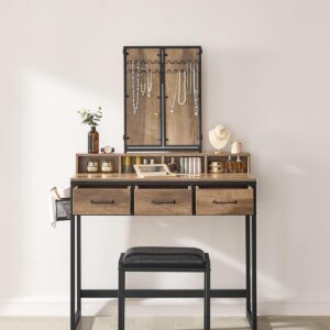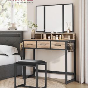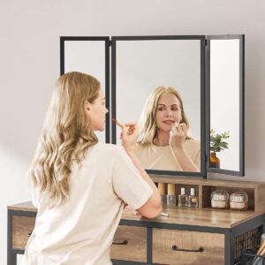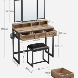 Masa de toaleta VASAGLE combina designul elegant cu functionalitatea, oferind un spatiu organizat pentru produsele de machiaj si ingrijire. Oglinda tripla rabatabila permite verificarea machiajului din mai multe unghiuri, iar compartimentele multiple ajuta la pastrarea ordinii. Setul include si un taburet tapitat confortabil, ideal pentru rutina zilnica de infrumusetare.
