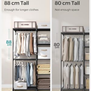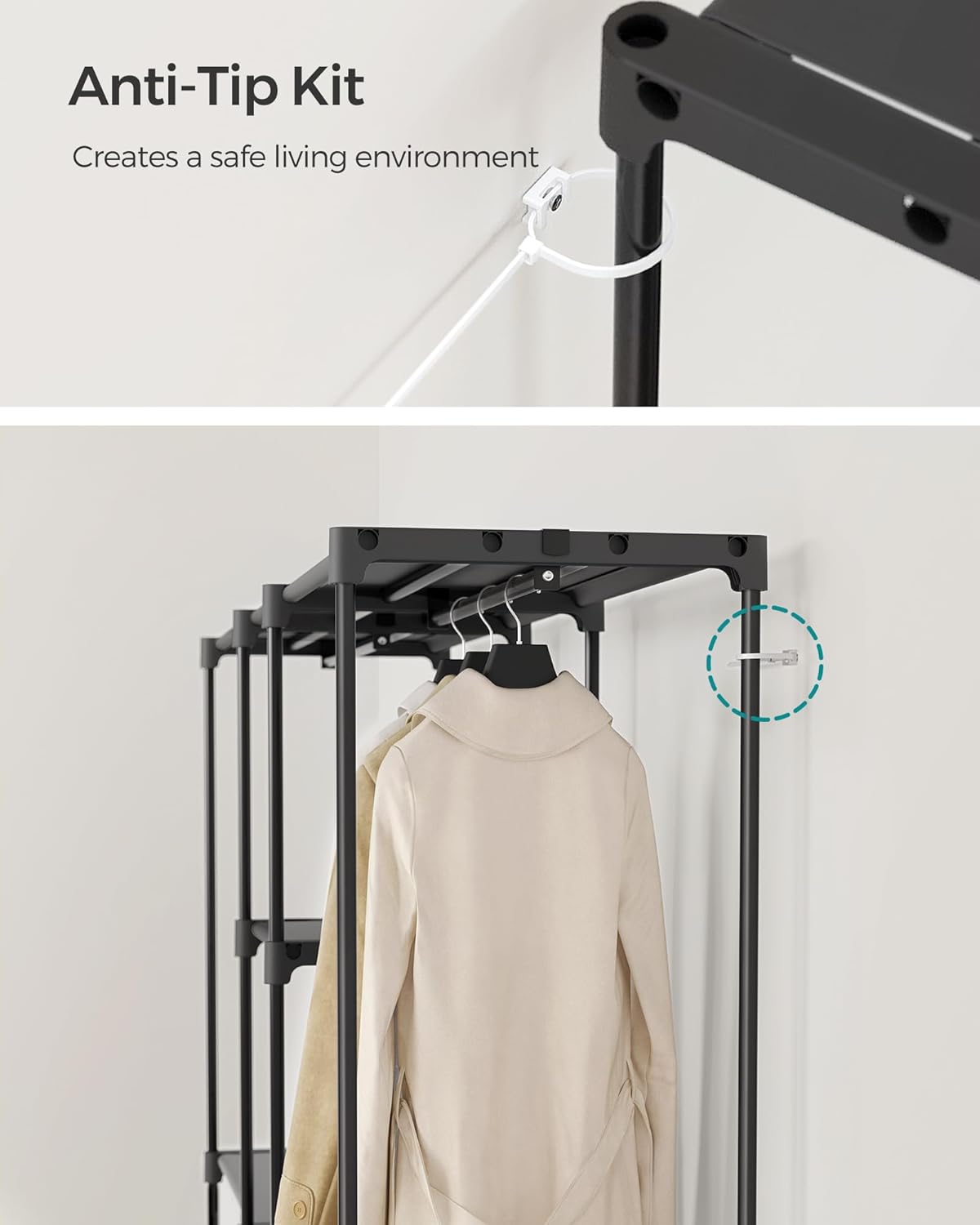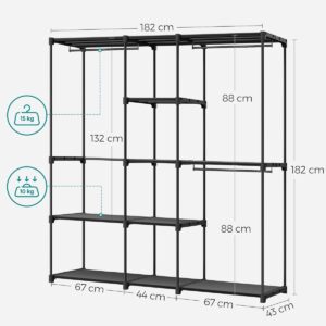 Dulapul portabil pentru haine este proiectat pentru organizarea eficienta a articolelor vestimentare si a accesoriilor. Cu multiple rafturi textile si compartimente de suspendare pentru haine scurte si lungi, ofera spatiu generos intr-un format practic si usor de integrat in orice incapere.