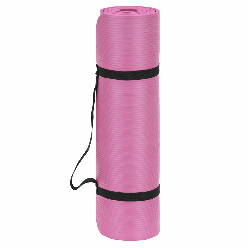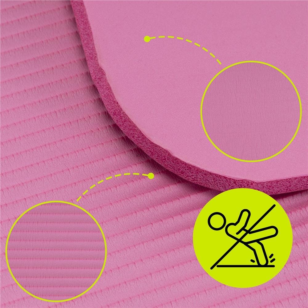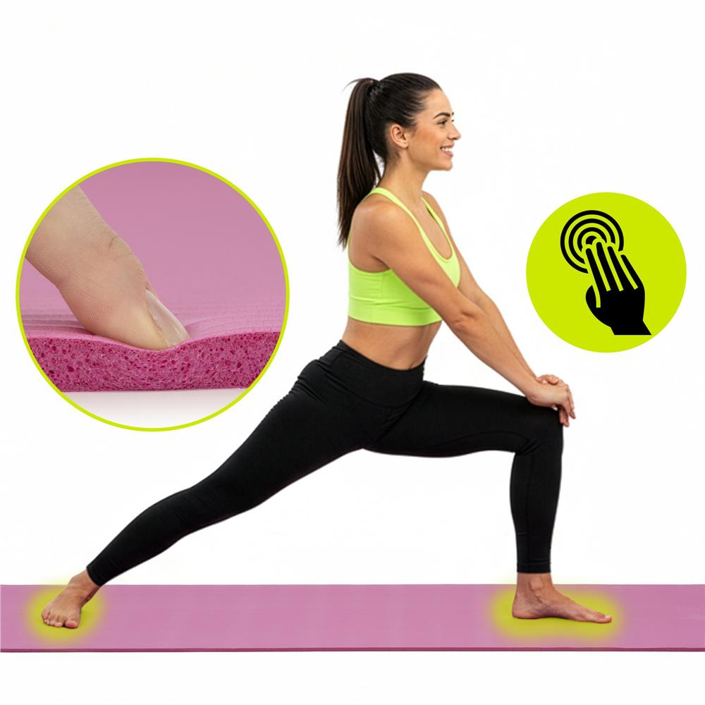 Saltea fitness realizata din NBR, potrivita pentru antrenamente usoare si medii. Ofera stabilitate buna pe podea si un nivel de confort adecvat pentru exercitii de intretinere, yoga sau pilates. Include curea elastica reglabila pentru transport facil.