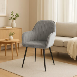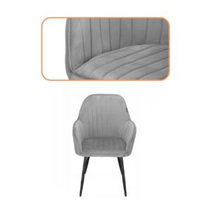 Scaunul tapitat in nuanta gri imbina eleganta catifelei cu functionalitatea unui design modern. Cu picioare metalice stabile si tapiterie placuta la atingere, acest scaun ofera confort si stil pentru orice spatiu interior.