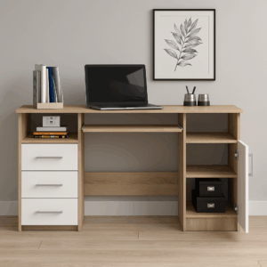 Biroul ANA combina functionalitatea cu designul modern in nuante calde de stejar sonoma si alb mat. Construit din PAL laminat durabil, este ideal pentru lucrul la calculator sau pentru studiu. Dispune de 3 sertare, 1 dulap cu usa si mai multe rafturi deschise, oferind spatiu generos pentru depozitare si organizare.