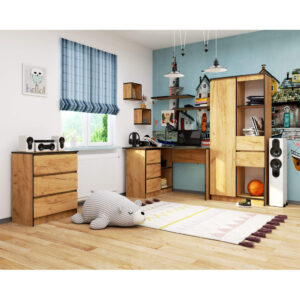 Biroul computer colt B16 stanga imbina designul practic cu eleganta finisajului stejar craft. Este realizat din PAL laminat Kronospan rezistent la uzura si prevazut cu trei sertare incapatoare si rafturi pentru depozitare eficienta. Blatul generos ofera spatiu confortabil pentru lucru, iar forma de colt optimizeaza utilizarea spatiului, fiind ideala atat pentru birouri, cat si pentru camere de tineret.