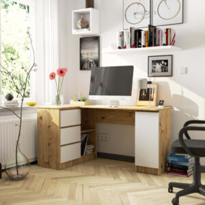 Birou colt modern cu blat generos in forma de L, realizat in finisaj stejar artisan cu fronturi albe. Ofera spatiu amplu si organizat pentru documente, carti si accesorii, fiind potrivit pentru birou, camera copilului sau zona de studiu.