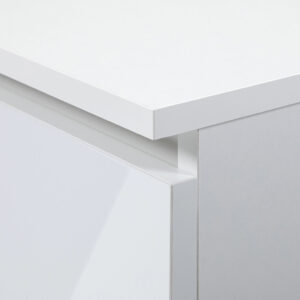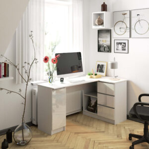 Birou de colt cu orientare pe dreapta, realizat din PAL laminat si fronturi MDF acrilice cu finisaj lucios. Ofera un blat mare pentru lucru, rafturi incapatoare si trei sertare pe glisiere metalice. Designul modern complet alb cu fronturi lucioase confera eleganta oricarui birou sau spatiu de studiu.