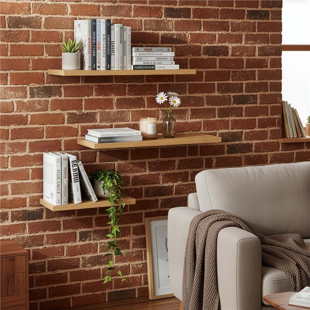 Setul de 3 rafturi de perete imbina MDF-ul cu elemente metalice pentru un aspect modern si decorativ. Finisajul maro aduce un aer cald si elegant, potrivit pentru living, dormitor, hol sau birou. Dimensiunile diferite ale rafturilor permit realizarea unor aranjamente creative pe perete pentru decoratiuni, plante mici sau obiecte personale.