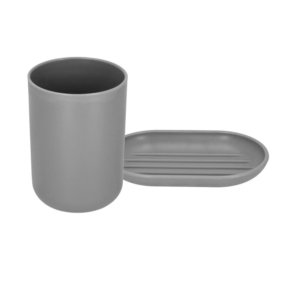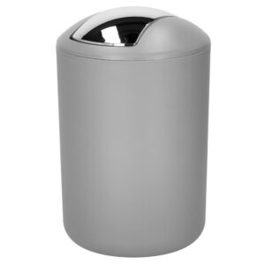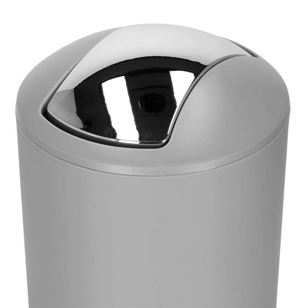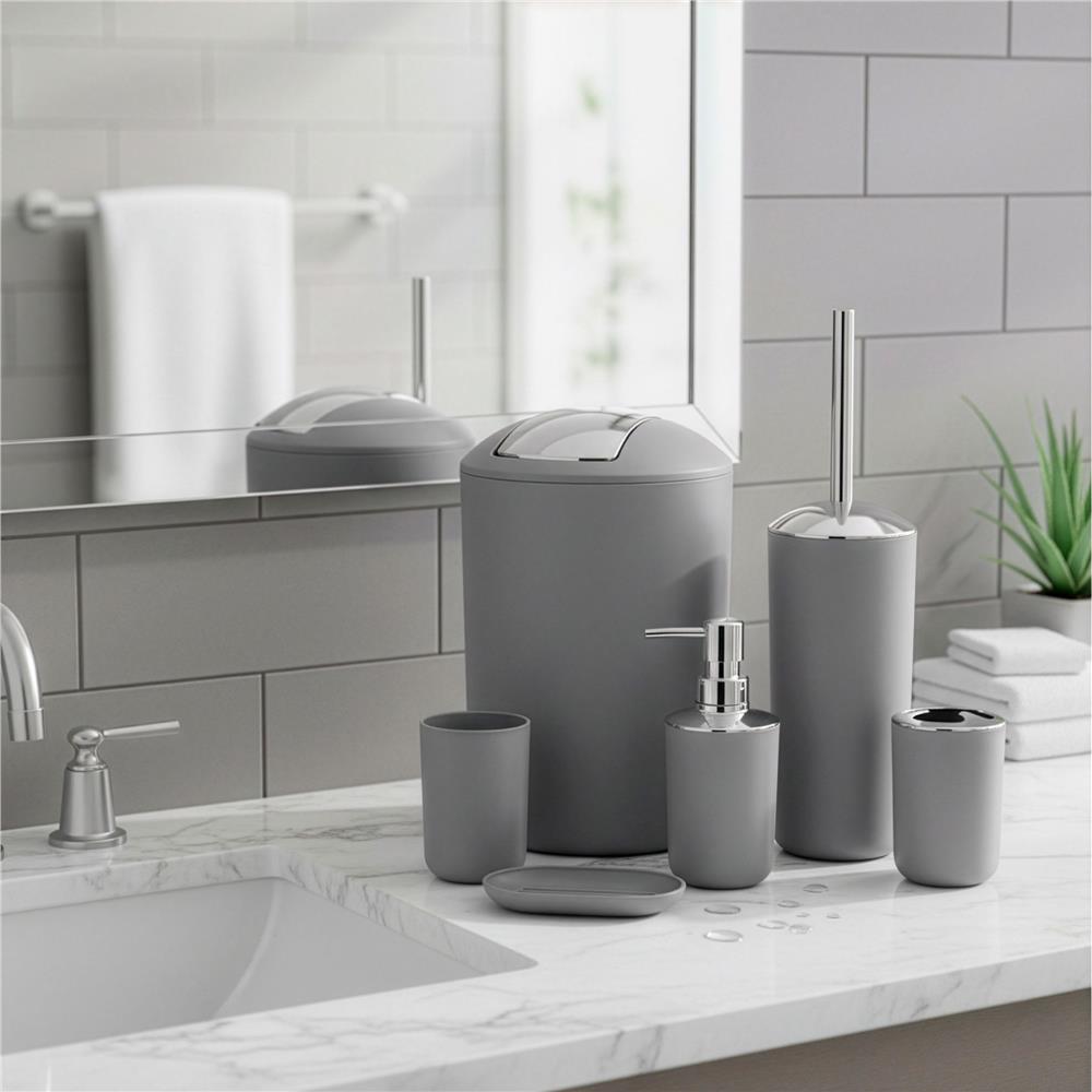 Set accesorii baie, 6 piese din plastic, cu perie WC si cos de gunoi, finisaj mat si lucios, gri argintiu Set accesorii baie, 6 piese din plastic, cu perie WC si cos de gunoi, finisaj mat si lucios, gri argintiu