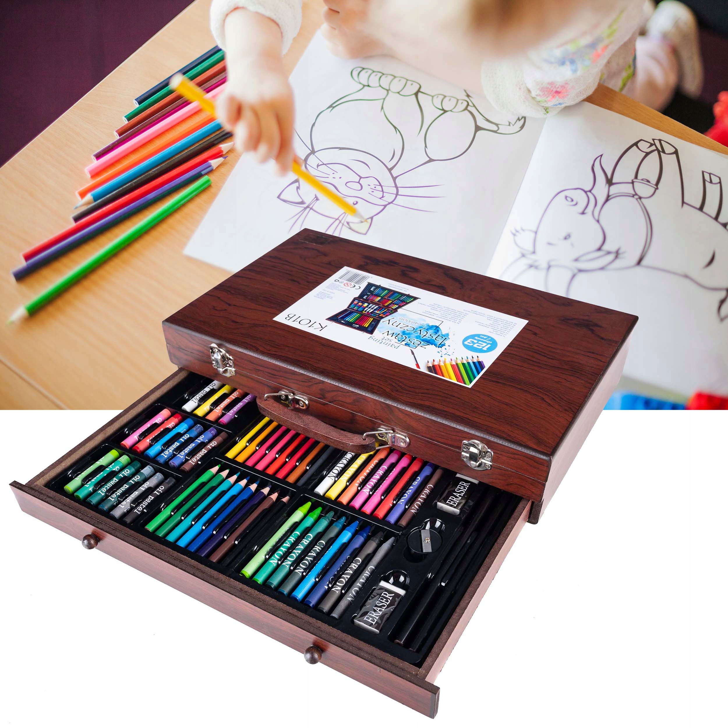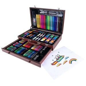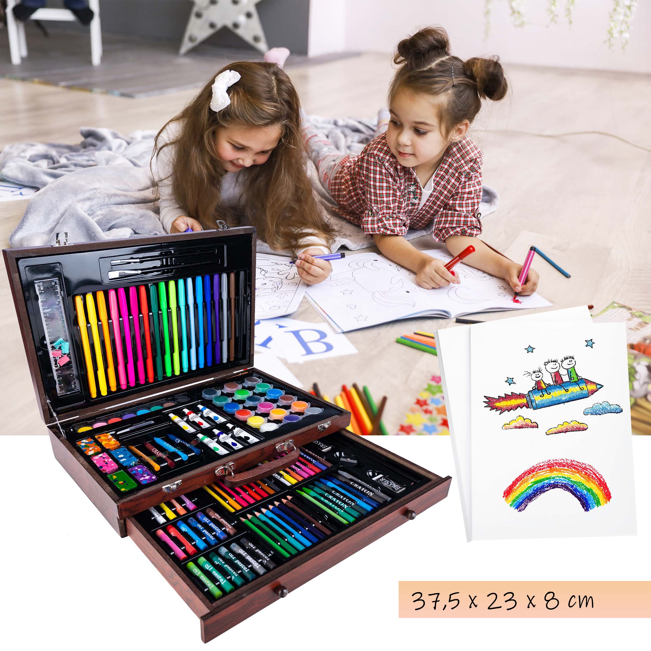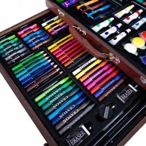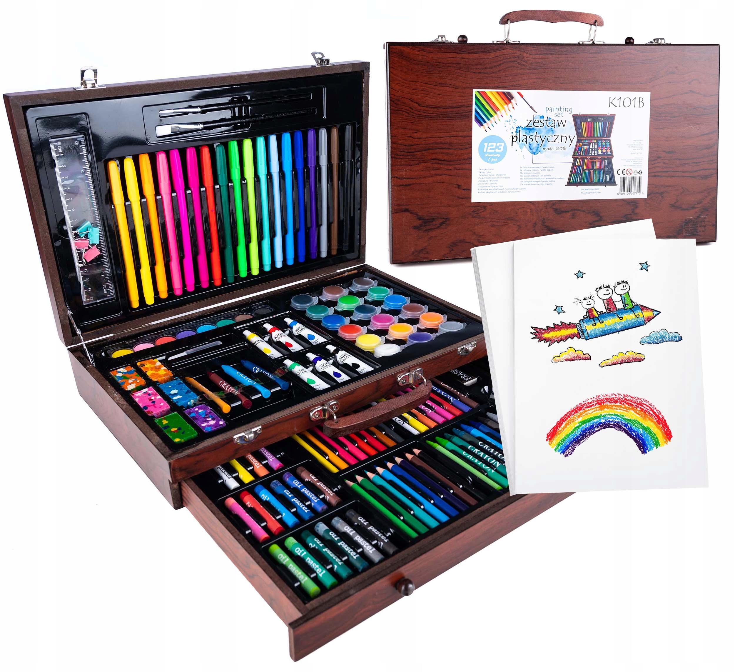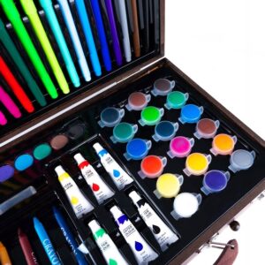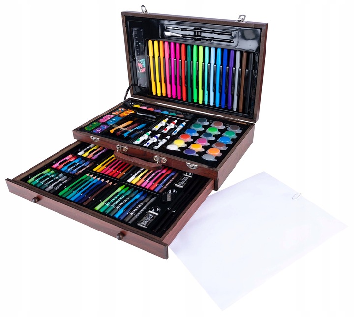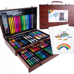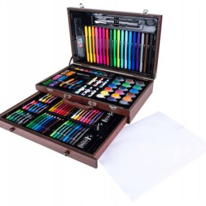 Set artistic complet de 130 piese, ideal pentru copii si tineri pasionati de desen si pictura. Valiza eleganta din lemn contine o gama variata de materiale – de la creioane si pensule, la acuarele, acrilice, creioane colorate, pasteluri si flamastri. Perfect ca set creativ pentru acasa sau ca idee de cadou.