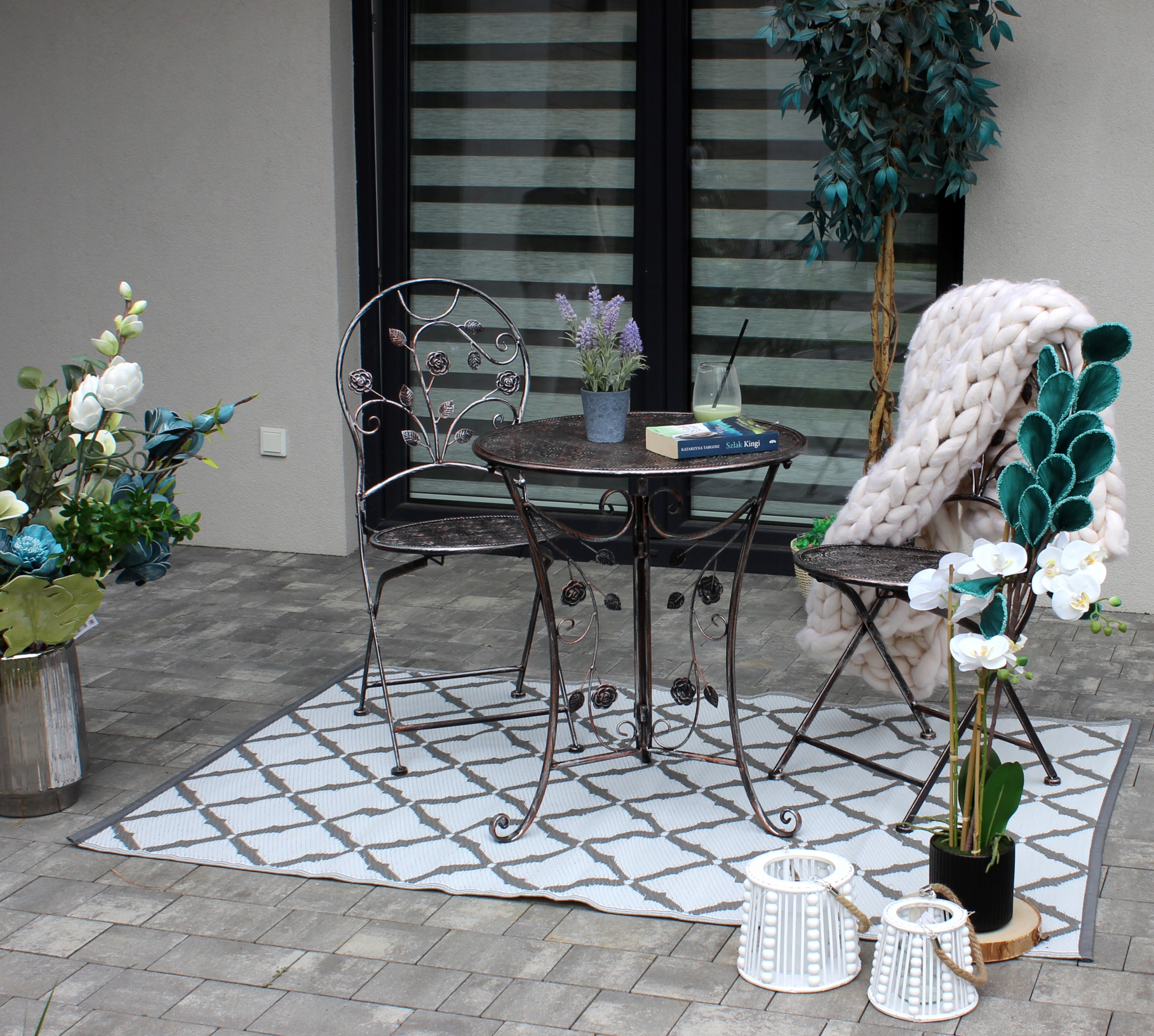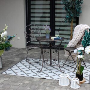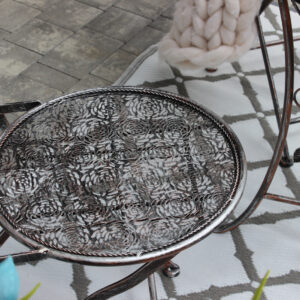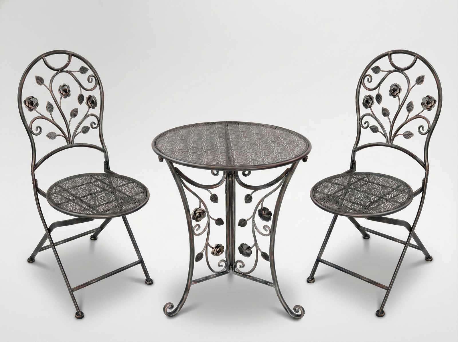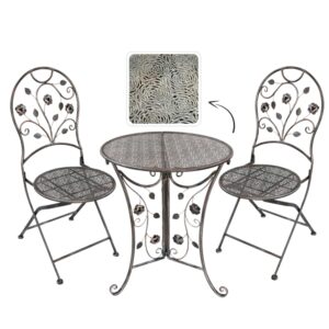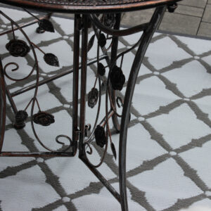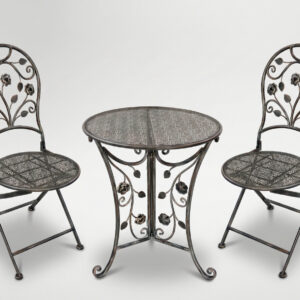 Acest set de mobilier de gradina imbina eleganta clasica cu durabilitatea metalului, fiind ideal pentru orice terasa, balcon sau gradina. Masa rotunda si cele doua scaune solide, decorate cu detalii florale deosebite, transforma orice spatiu intr-un colt relaxant si rafinat.
