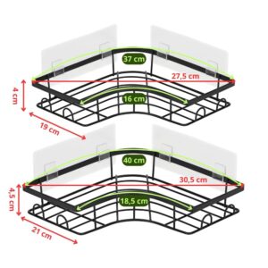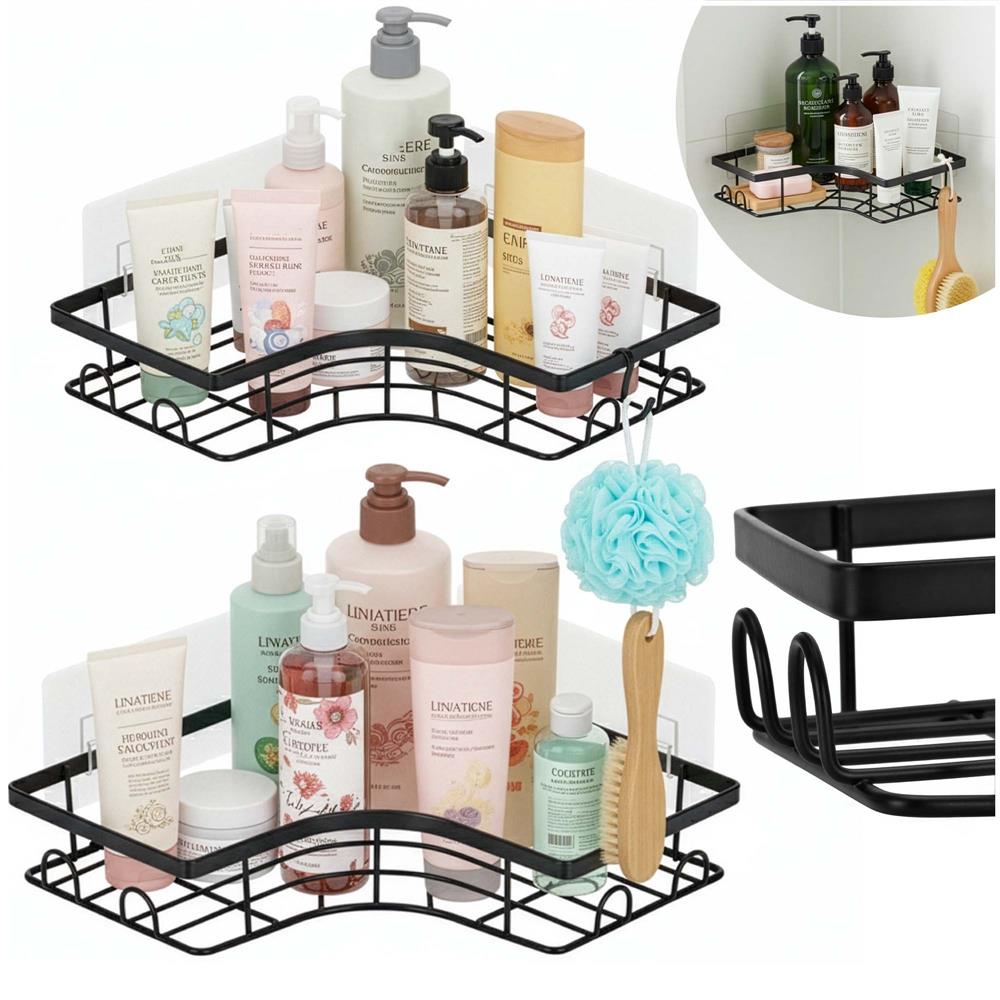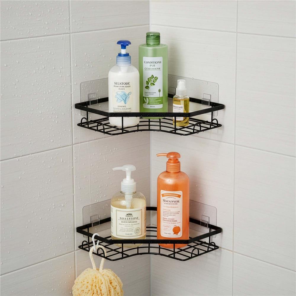 Set de doua polite de colt din otel inoxidabil, concepute pentru organizarea eficienta a spatiului fara gaurire. Montajul autoadeziv permite instalarea rapida pe suprafete netede, fiind potrivite pentru baie sau bucatarie.
