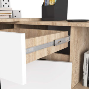 Set de birou cu comoda incorporata, realizat din PAL laminat rezistent la uzura. Permite montaj pe stanga sau pe dreapta pentru adaptare la orice spatiu. Ofera rafturi incapatoare, sertar cu glisiere metalice si spatiu generos pentru lucru. Design modern in sonoma si alb, potrivit pentru birouri, camere de studiu sau camere de adolescenti.