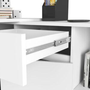 Birou de colt modern cu comoda integrata, ideal pentru spatii mici de lucru. Oferind rafturi deschise, sertar util si compartiment inchis, combina designul minimalist cu functionalitatea.