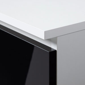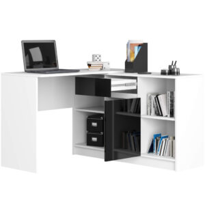 Birou de colt modern cu comoda integrata, creat pentru spatii mici si medii. Ofera compartimente deschise si inchise, un sertar util si un blat generos pentru lucru. Combinatia alb-negru lucios aduce un aspect elegant si contemporan.