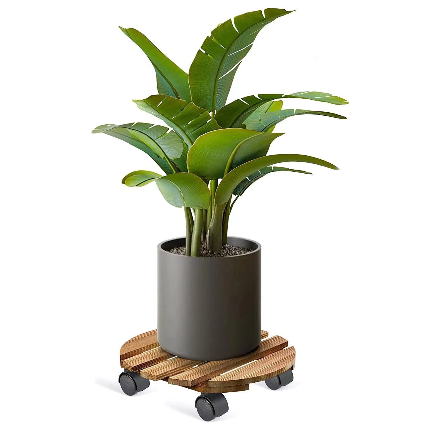 Suport rotund pentru ghiveci din lemn cu roti, 30 cm, maro natural
