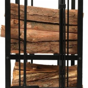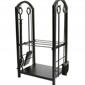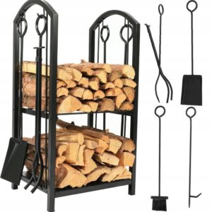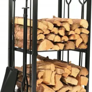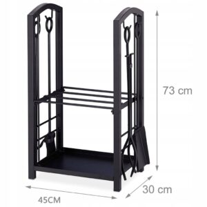 Suportul metalic pentru lemne permite organizarea eficienta a lemnelor de foc si a accesoriilor pentru semineu. Constructia din otel asigura stabilitate si rezistenta, iar setul de 4 unelte incluse faciliteaza intretinerea focului si curatarea zonei. Designul negru mat se potriveste in orice interior.