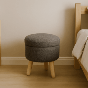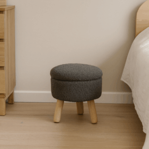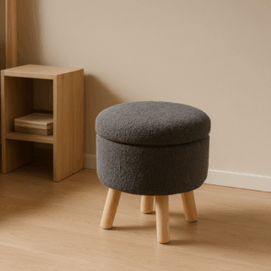 Taburetul rotund cu tapiterie gri si picioare din lemn imbina eleganta cu functionalitatea. Compact si confortabil, este ideal atat ca scaun suplimentar, cat si ca suport pentru picioare sau decor modern in orice incapere.
