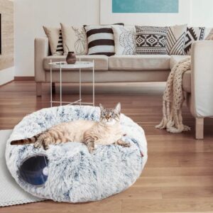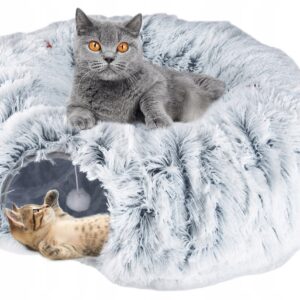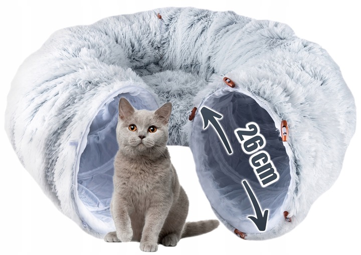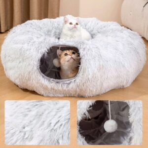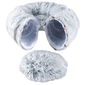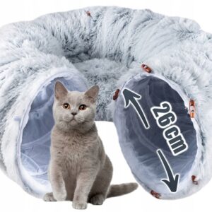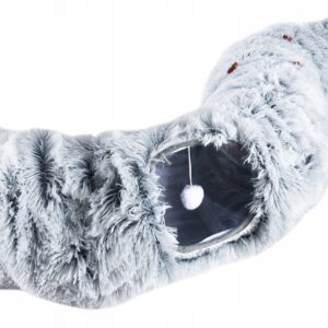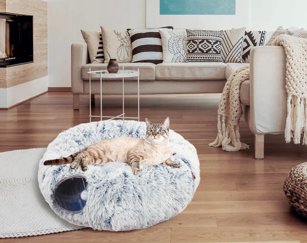 Tunel moale pentru pisici, realizat din plus, care se transforma rapid intr-un pat rotund si confortabil pentru joaca, odihna si relaxare.