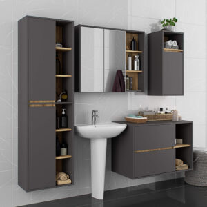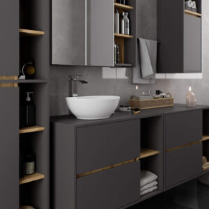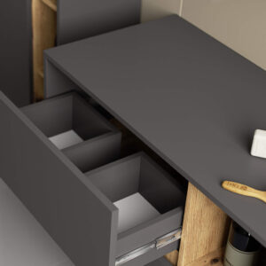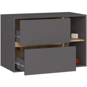 Dulapul de baie suspendat VAMI W90 combina designul modern cu functionalitatea inteligenta. Construit din PAL laminat rezistent la umiditate, ofera durabilitate si aspect elegant datorita finisajului mat in nuante de gri grafit si stejar artisan. Cele doua sertare spatioase si rafturile deschise asigura spatiu generos pentru depozitarea produselor de igiena, a prosoapelor si a accesoriilor. Marginile sunt protejate cu okleina ABS, oferind rezistenta suplimentara la uzura si umezeala. Modelul este conceput special pentru montaj sub lavoar, cu spatiu dedicat pentru sifon si instalatii.