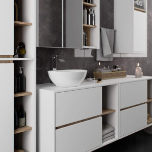 Dulapul de baie suspendat VAMI W90 este o alegere moderna si functionala pentru amenajarea baii. Fabricat din PAL laminat rezistent la umiditate, ofera doua sertare spatioase si doua rafturi deschise pentru organizarea produselor de igiena, a prosoapelor sau a accesoriilor. Finisajul mat in combinatie alb/stejar sonoma adauga luminozitate si naturalete incaperii. Marginile sunt protejate cu okleina ABS, care asigura rezistenta in timp si impiedica deteriorarea la contactul cu umezeala. Modelul este conceput pentru montaj suspendat sub lavoar, cu spatiu special pentru sifon si instalatii.